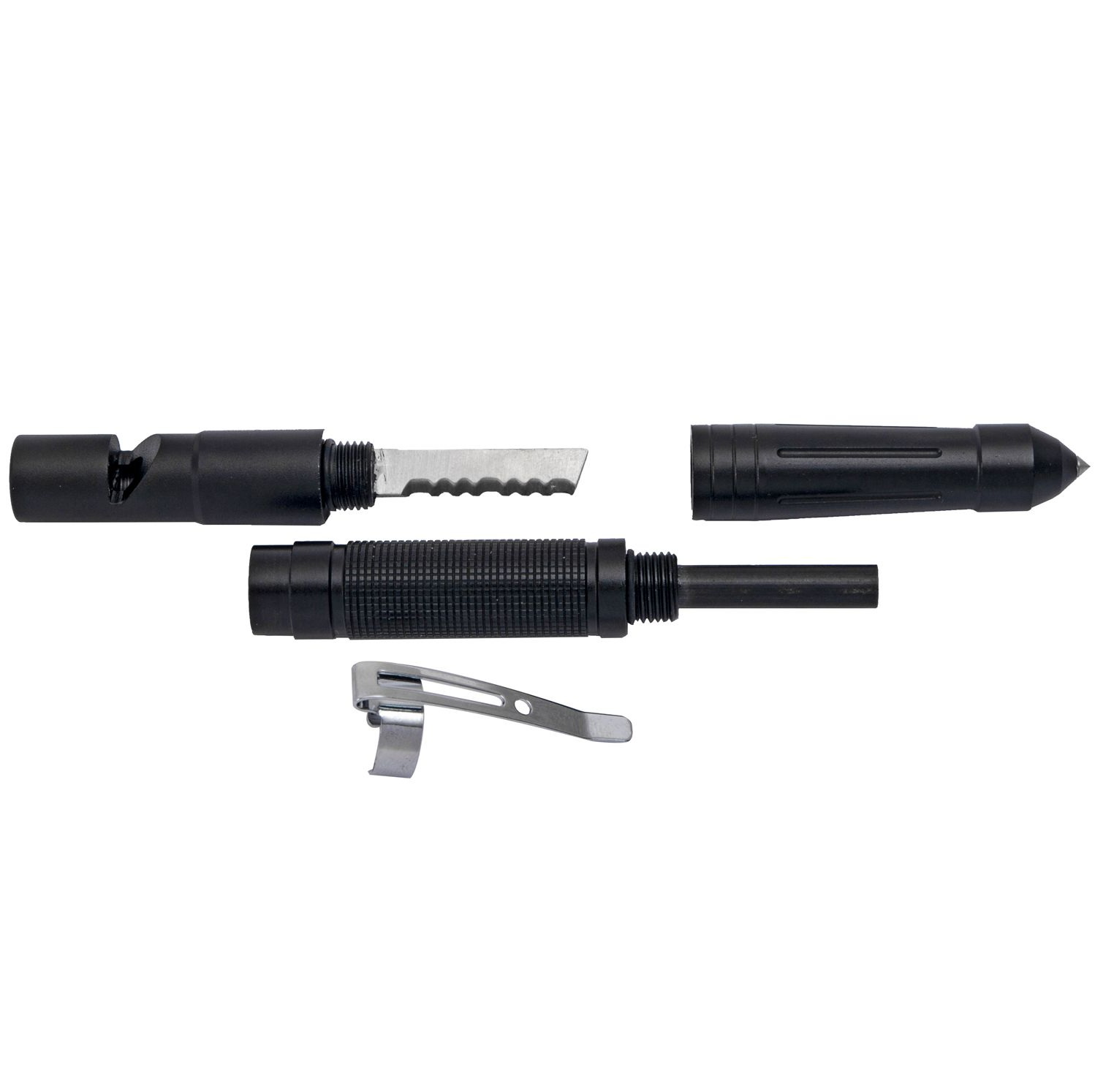 Dieses praktische 4 in 1 Tool gehört in jede Ausrüstung. Aus hochwertigem Aluminium gefertigt und kaum größer als ein Kugelschreiber vereint das Tool vier Funktionen um sich im Notfall zu helfen: einen Nothammer für Autoglas, eine laute Notfallpfeife, einen Zündstahl sowie eine sehr scharfe Säge. Die Gewinde des Tools haben ein sehr geringes Spaltmaß sowie eine Dichtung und sorgen dafür, dass Zündstahl und Säge vor Feuchtigkeit geschützt sind.