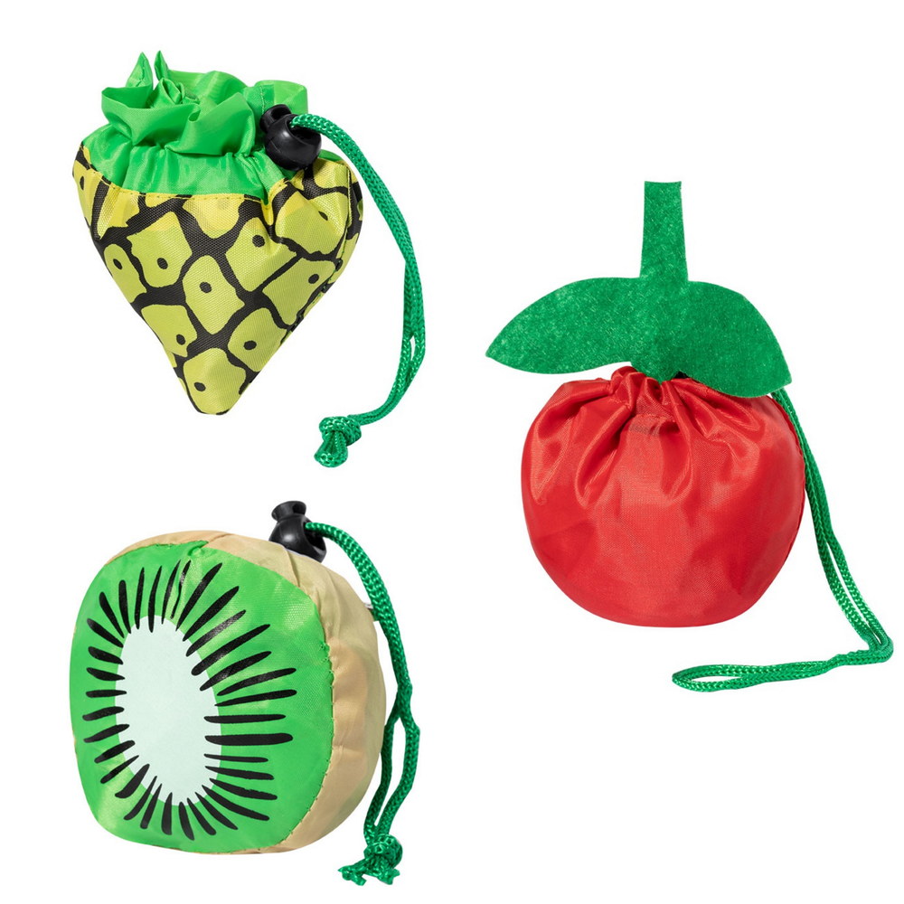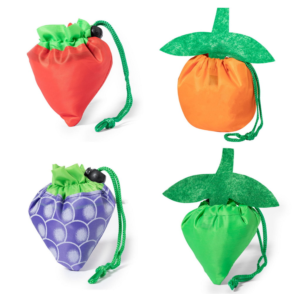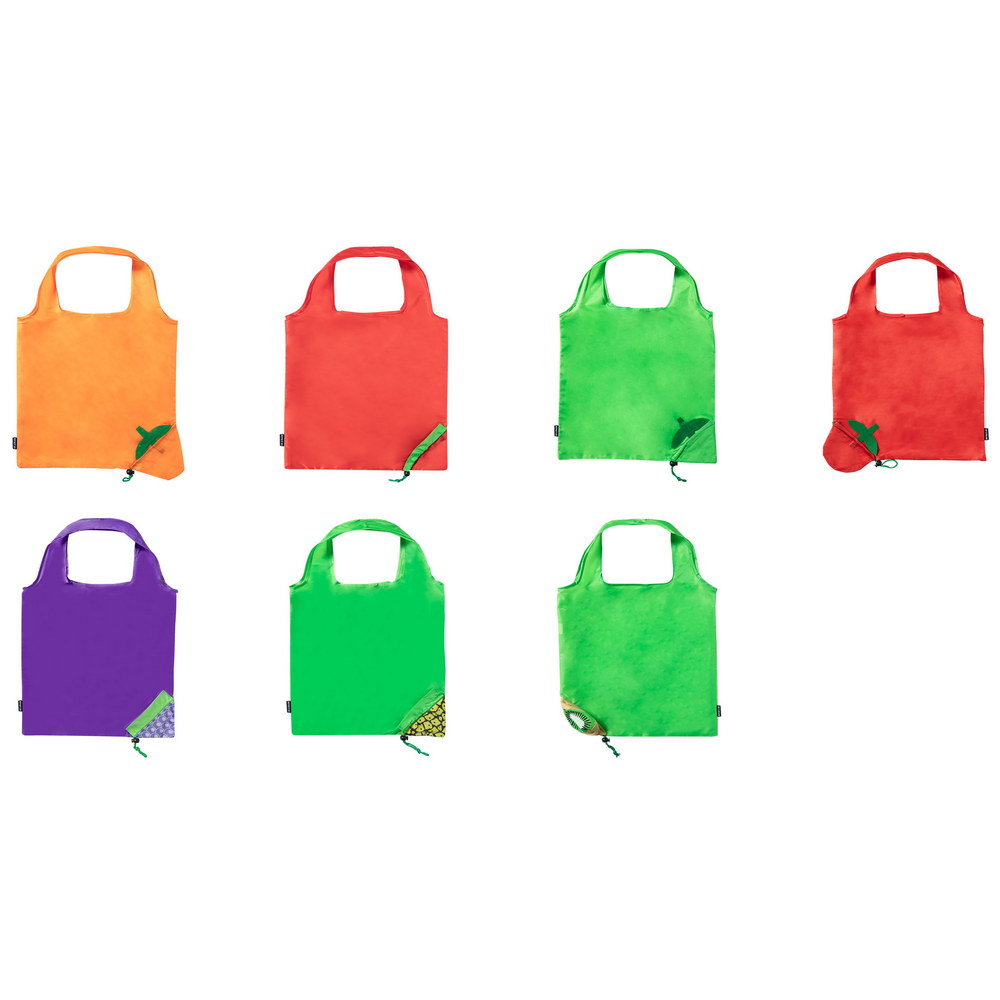 Faltbare Tasche aus RPET 190T mit Obstdesign. Inklusive Befestigungszubehör für einfaches Falten und RPET-Label. Mit einer Tragfähigkeit von bis zu 7 kg. Das RPET-Material wird aus recyceltem Kunststoff hergestellt, um die Wiederverwendung von Kunststoffabfällen zu fördern und zur Nachhaltigkeit des Planeten beizutragen.