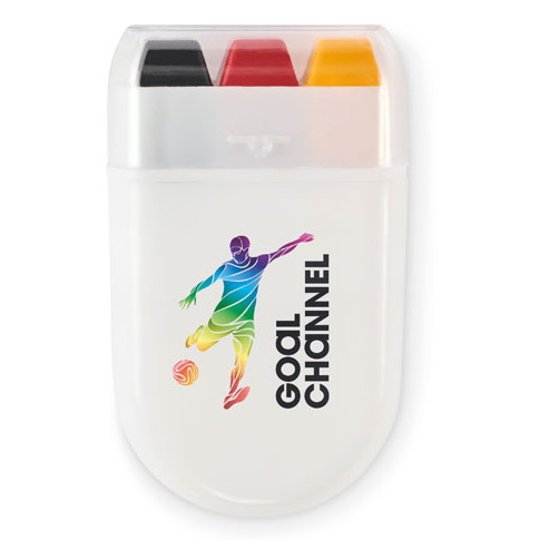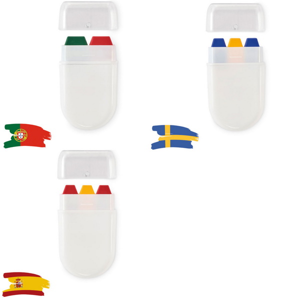 Fan Schminkstift in verschiedenen Flaggen-Farben. Wachsfarbe in PP-Gehäuse mit PS-Deckel.