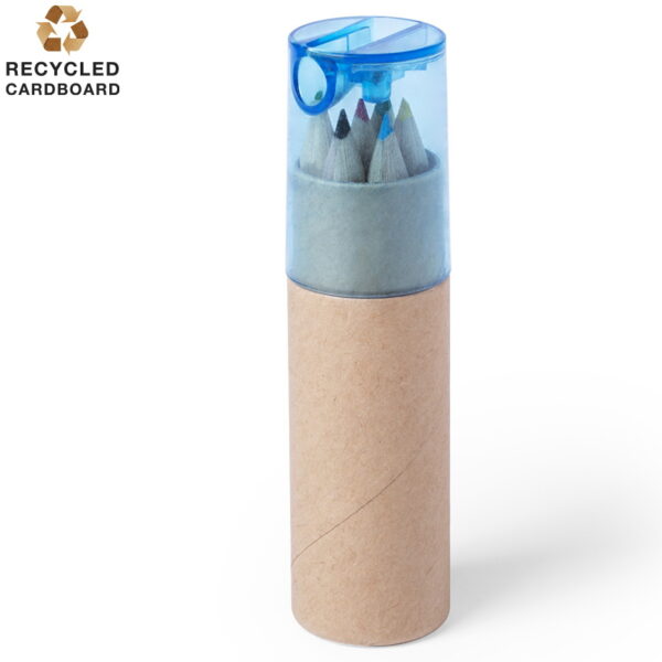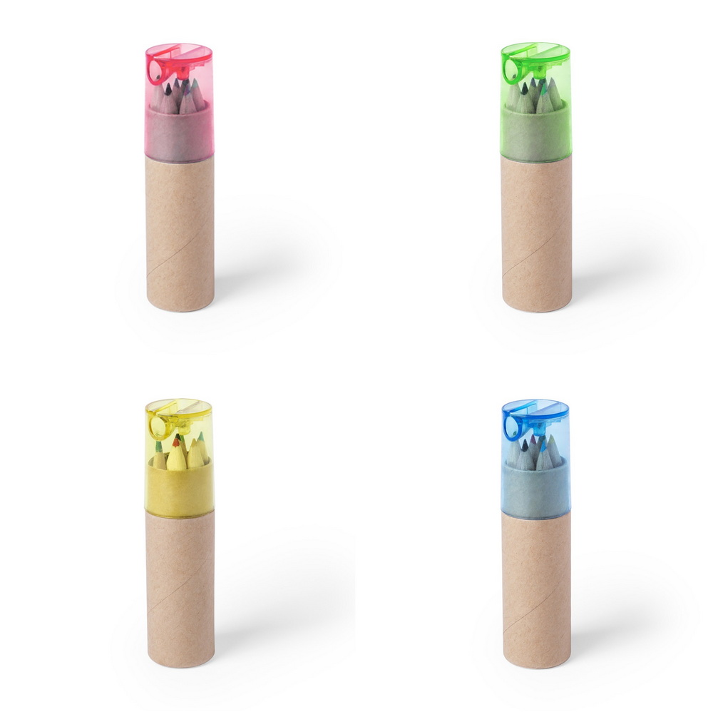 Farbstifte-Set in einer zylinderförmigen Box aus Naturkarton mit 6 verschiedenen Farbstiften und transparentem Deckel in verschiedenen Farben. Buntstifte mit sechseckigem Schaft in Naturfarbe und einen im Deckel integrierten Anspitzer.
