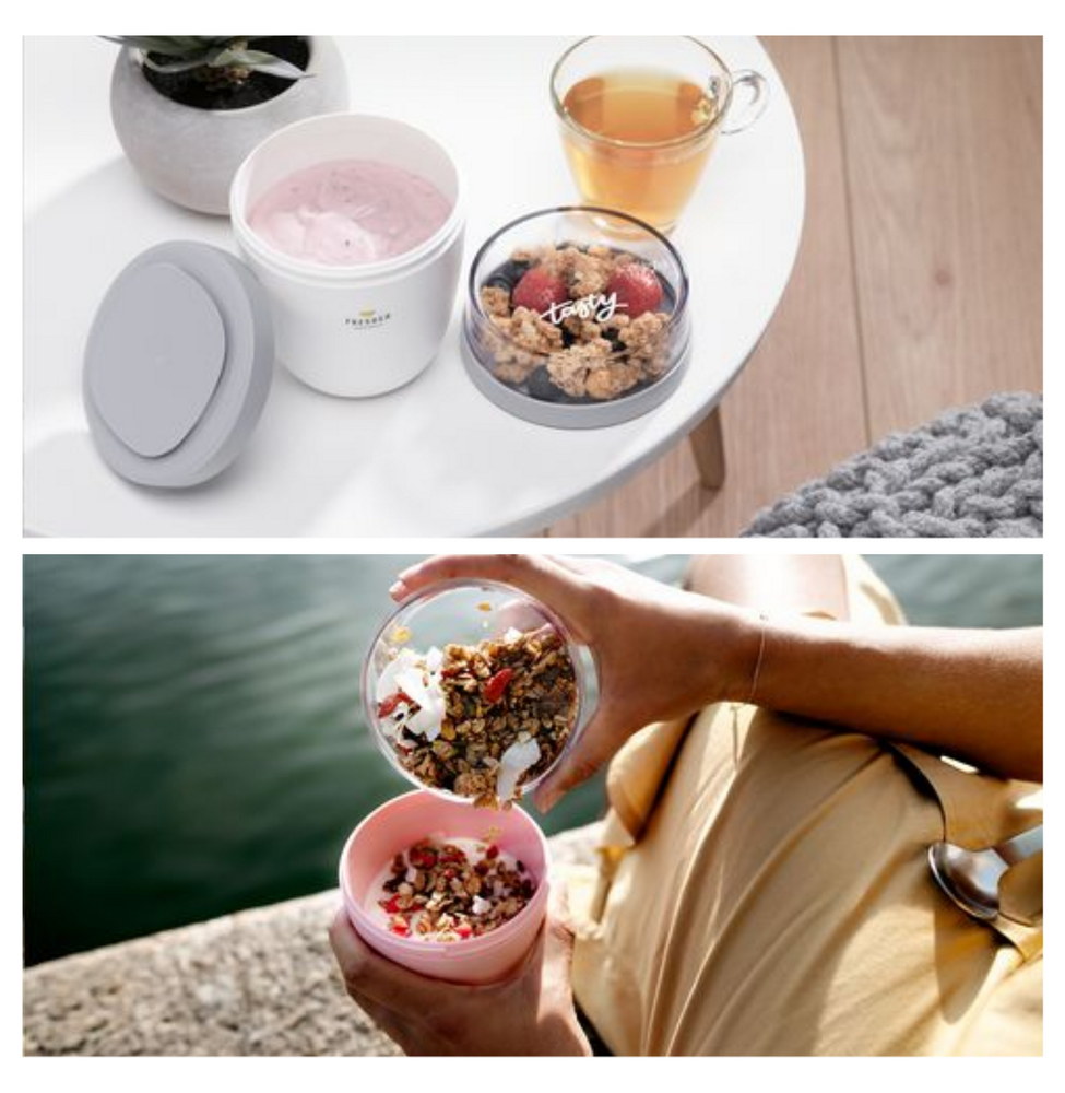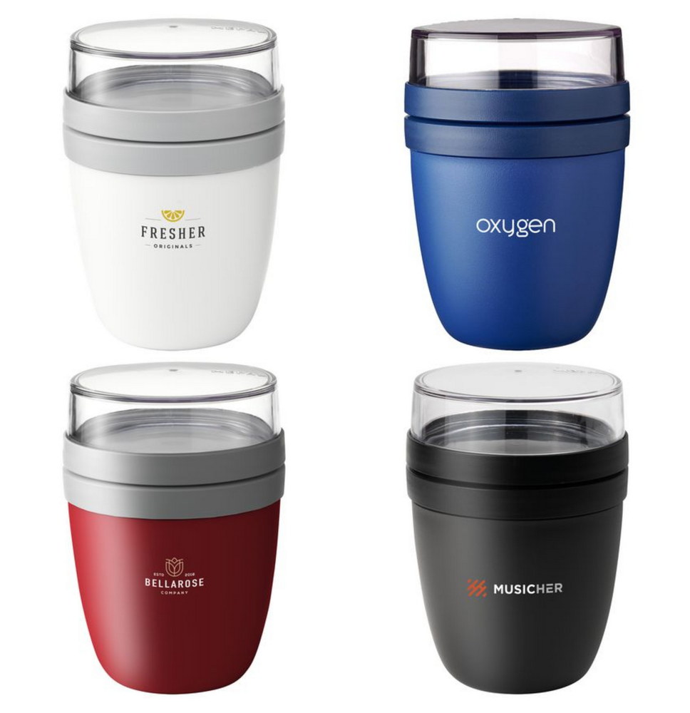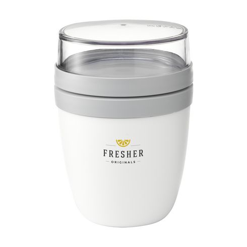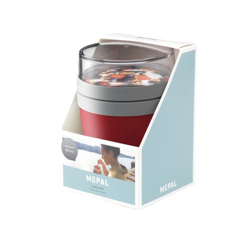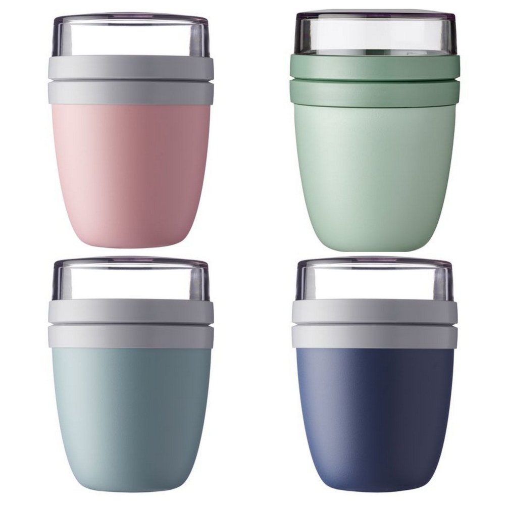 Praktischer Mepal-Behälter mit zwei getrennten Teilen und Deckeln – ideal zum Mitnehmen und Mixen ohne Kleckern. Oben 200 ml für Müsli/Obst, unten 500 ml für Suppe oder Joghurt. Auslaufsicher, mikrowellen- (ohne Deckel) und gefriergeeignet. Hergestellt in den Niederlanden. 2 Jahre Garantie.