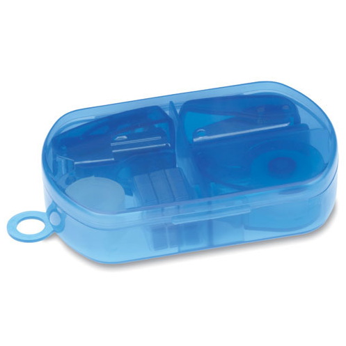 Mini-Büroset in einer Kunststoffbox. Inklusive Tacker, Tackermunition, Klebebandrolle sowie Locher.