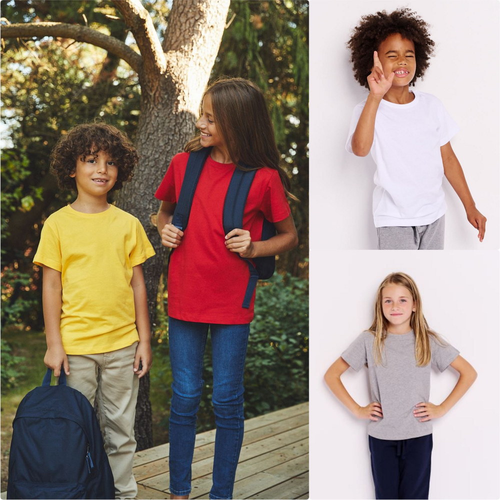 Rundhalsausschnitt, reguläre kurze Ärmel, Elastan-Rippstrick am Kragen, innenliegendes Nackenband.