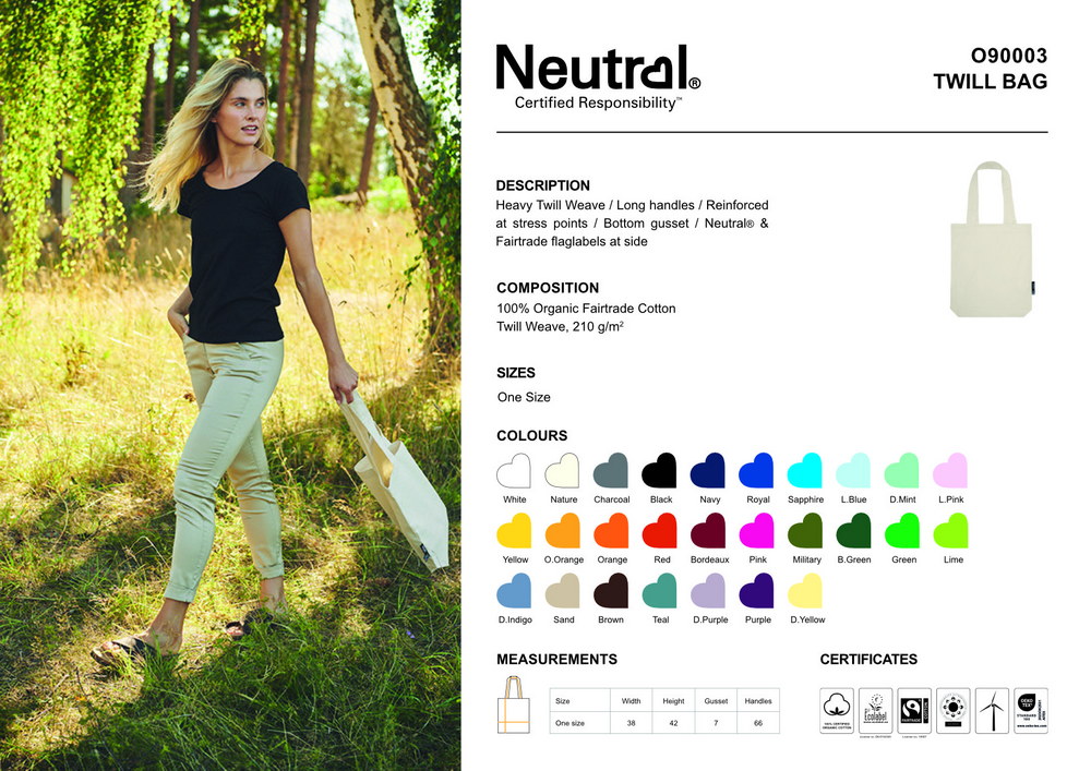 Tasche mit Bodenfalte für mehr Stauraum, verstärkte Belastungspunkte, sichtbare Neutral und Fairtrade-Labels an den Seiten.