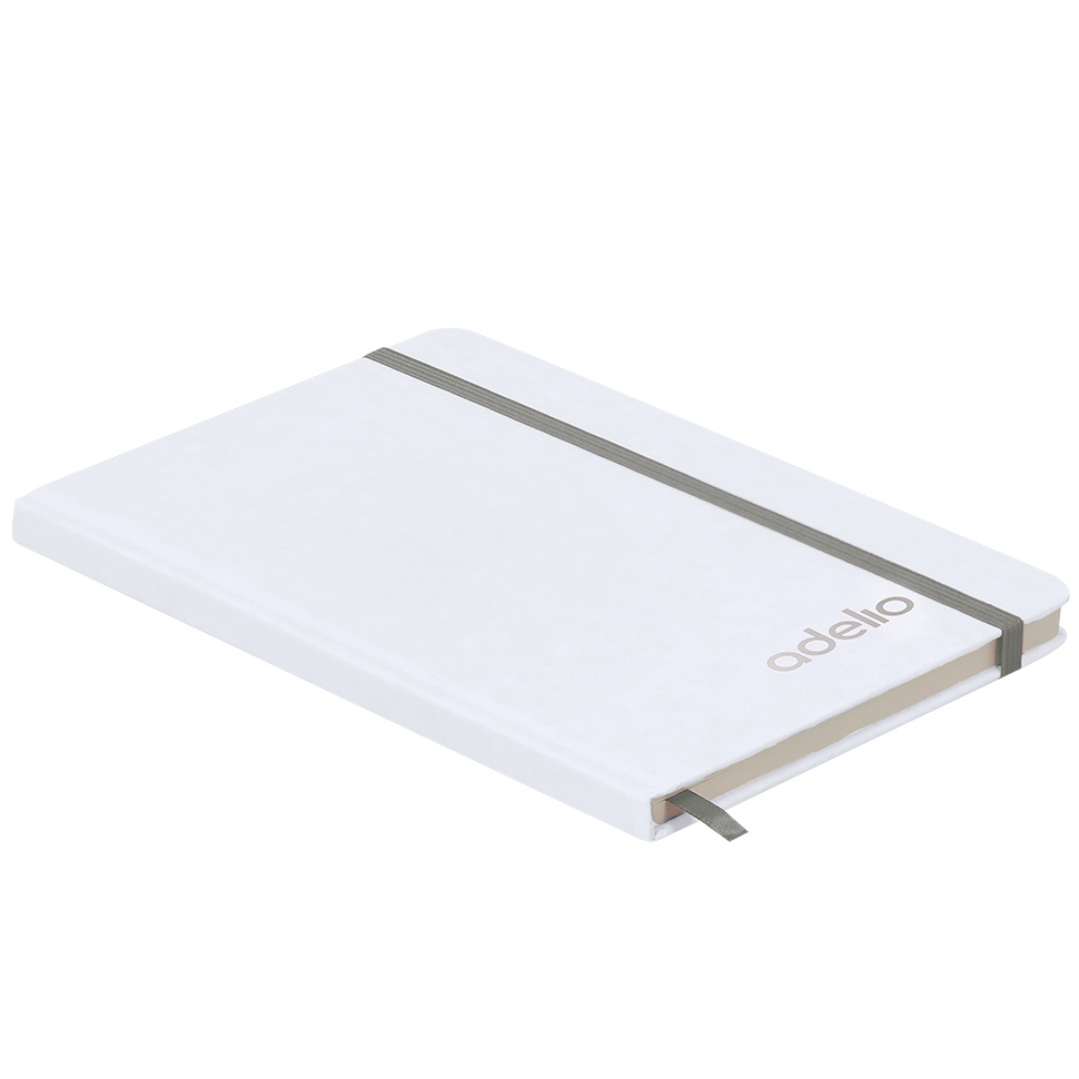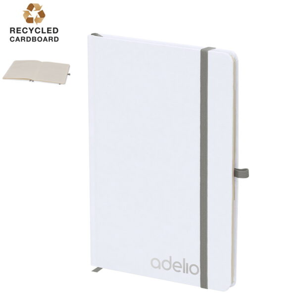 Nachhaltiger Notizblock mit steifen, weißen Einbänden aus recyceltem Karton. 80 verfügbare Blätter, elastisches Verschlussband in verschiedenen Farben erhältlich. Inklusive Stifthalter und Lesezeichen in der selben Farbe, wie Verschlussband.