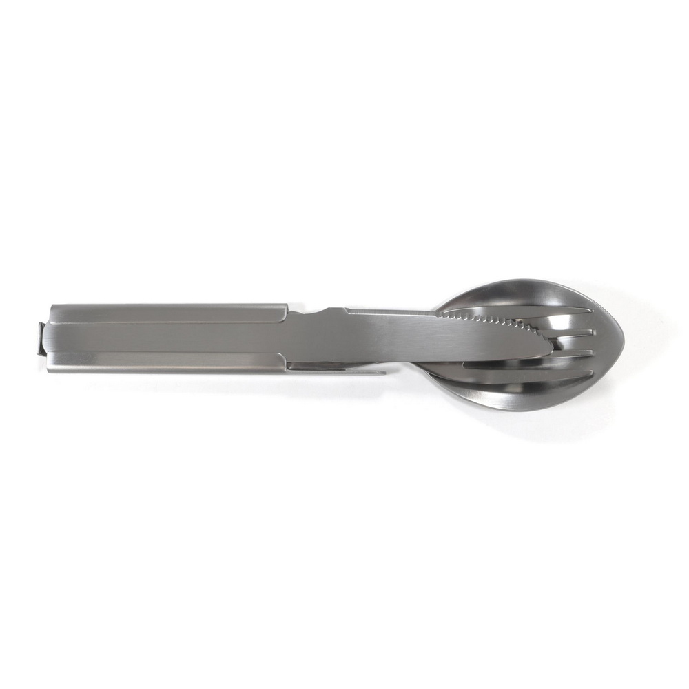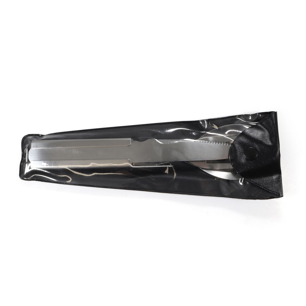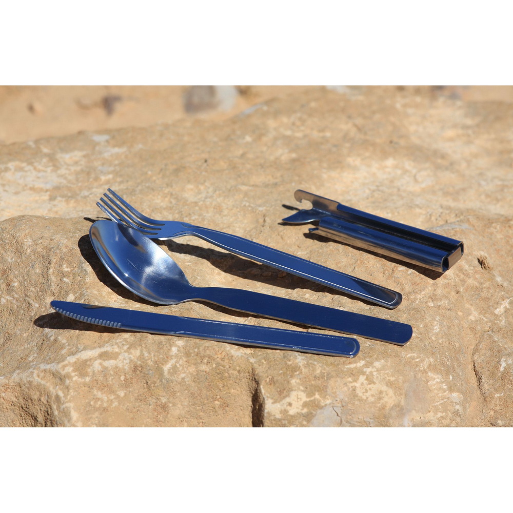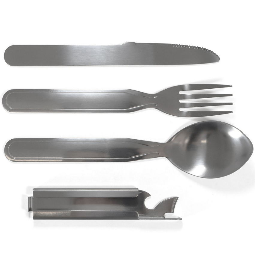 Einfaches und äußerst stabiles Edelstahlbesteck von guter Qualität, gefertigt aus rostfreiem Edelstahl. Mit Dosen- und Flaschenöffner ausgestattet. In der Funktion dem Bundeswehrbesteck nachempfunden. Das Besteck lässt sich für den kompakten Transport schnell und einfach ineinander stecken.