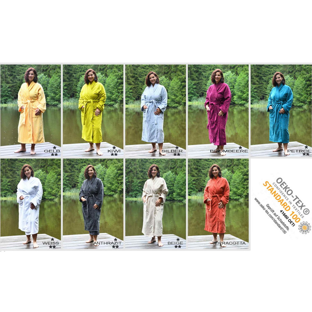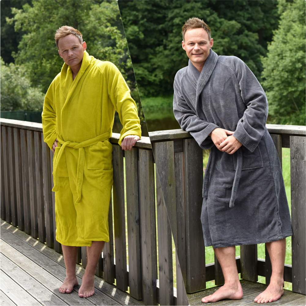 Schalkragenbademantel aus super weichem Material, zu 100 % Made in Austria. Gewirkte schlingenzugfeste Veloursqualität 330 g/m². Außenseite: 100% Polyester Microfaser Velours für einen weichen samtartigen Griff und leichte Reinigung. Innenseite: 50% Baumwolle, 50% Bambus für hervorragenden Tragekomfort und enorme Wasseraufnahme durch die Bambusfaser. Bademantel mit zwei Seitentaschen, Bindegürtel mit Halteschlaufen.