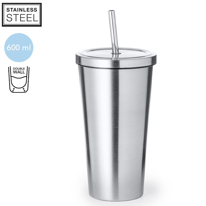 Stilvoller doppelwandiger Thermobecher aus Edelstahl mit 600 ml Fassungsvermögen. Mattes Finish, mit Schraubdeckel und passendem Strohhalm. Hält dein Getränk sowohl kalt, als auch warm!