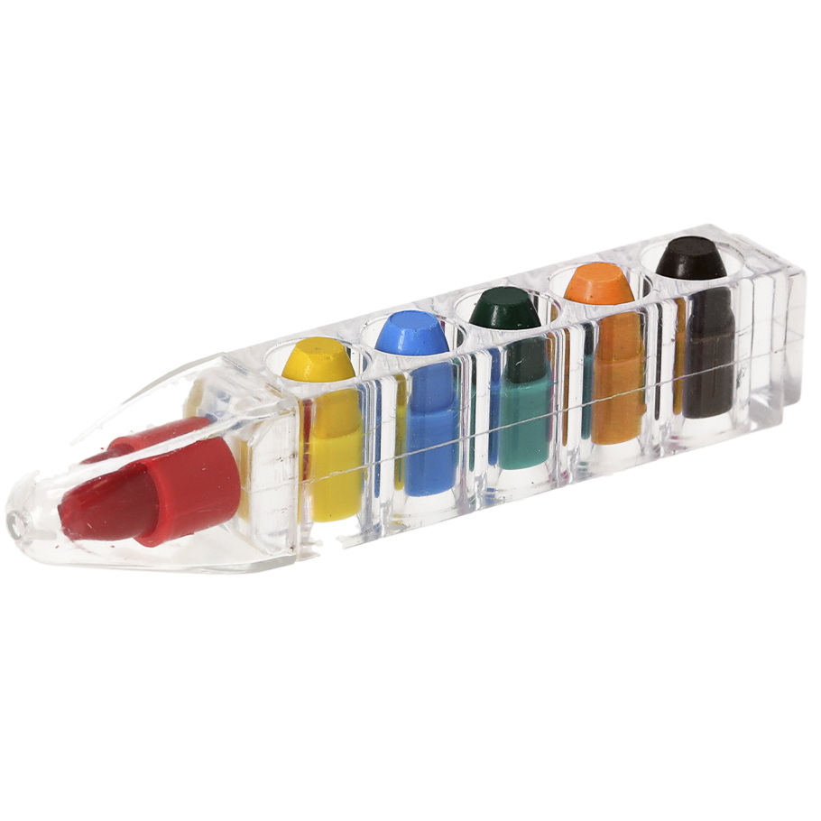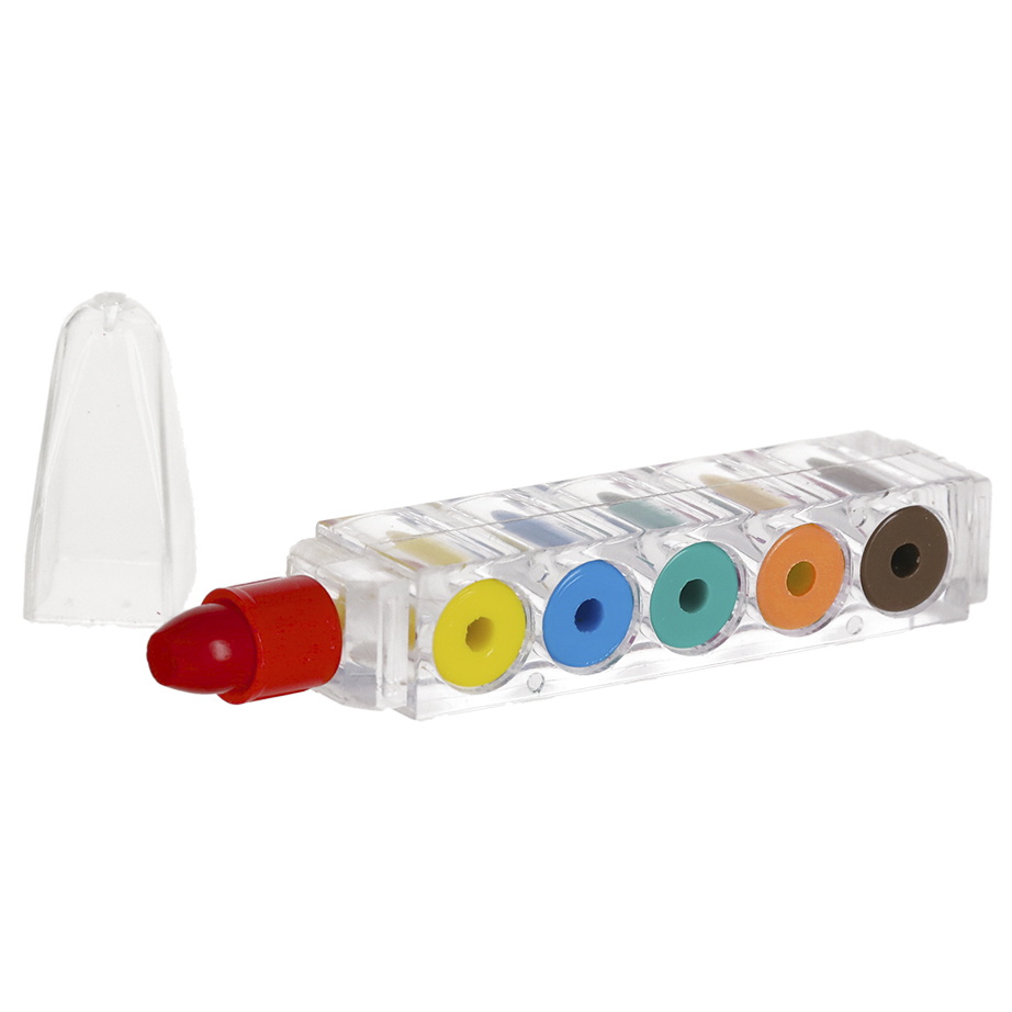 Satz von Wachsmalstiften im Stift-Format. Aneinandergereiht in einem transparenten PS-Gehäuse. Bestehend aus sechs Wachsspitzen in austauschbaren Farben (gelb, blau, rot, grün, orange und braun). Inklusive Schutzkappe für die oberste Spitze. Ideales Geschenk für Kinder.