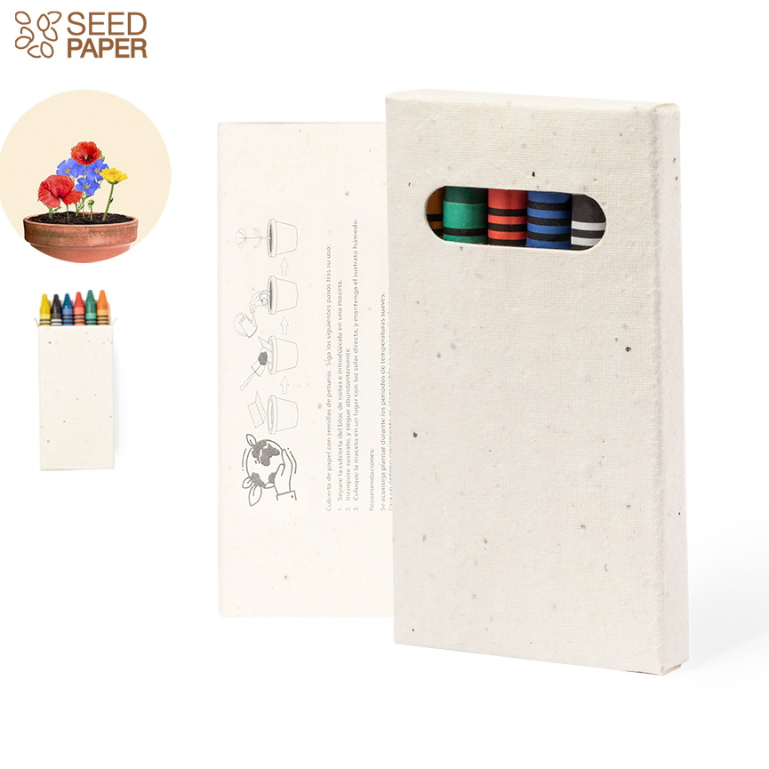 Set aus 6 Wachsmalstiften, verpackt in einer natürlichen Pappschachtel aus Samenpapier mit Petuniensamen. Den Karton kannst du nach dem Malspaß direkt zur Bepflanzung deines Gartens verwenden! Cool, oder? So reduzierst du Müll und leistest einen kleinen Beitrag für deine Umwelt. Blumen in verschiedenen Farben, mit Pflanzanleitung auf der Rückseite des Umschlags.